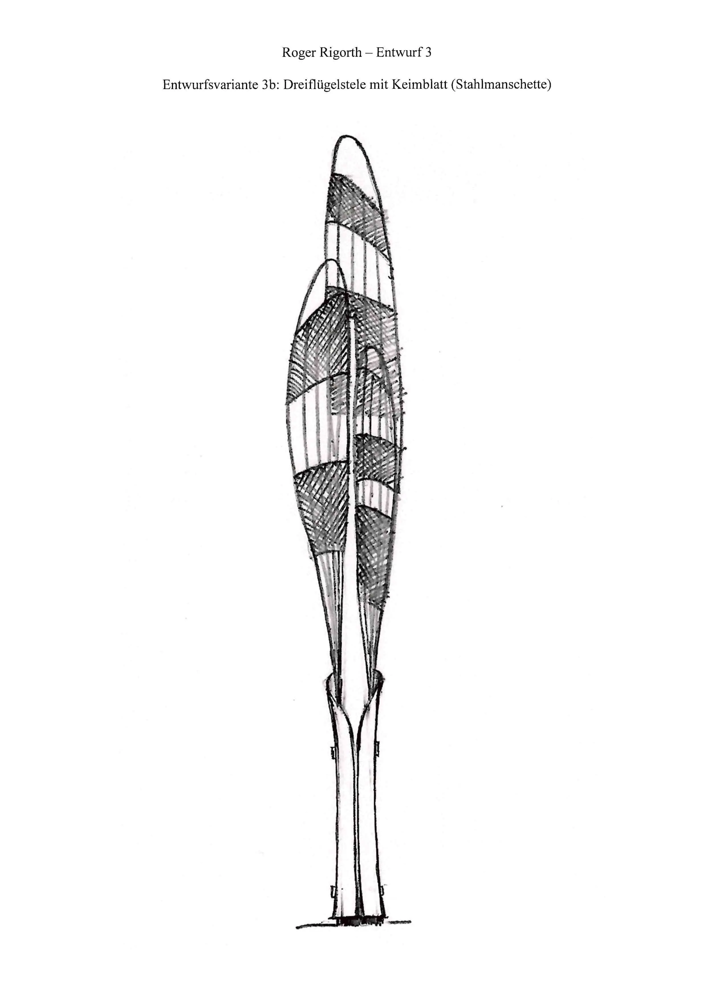 Die Stele ist die Symbiose mehrerer Aspekte. So finden sich in den Flügeln das Aufstrebende, sich emporheben wollen und das Streben über den Horizont heraus. Fast schon floral entwachsen sie der Stele. So wird Schwinge zum Blatt und weiter zum Segel, das an der mastartigen Stele angeschlagen ist und wird schließlich wieder zu Lichtsegeln, die das lichte Seelengold in sich tragen.
