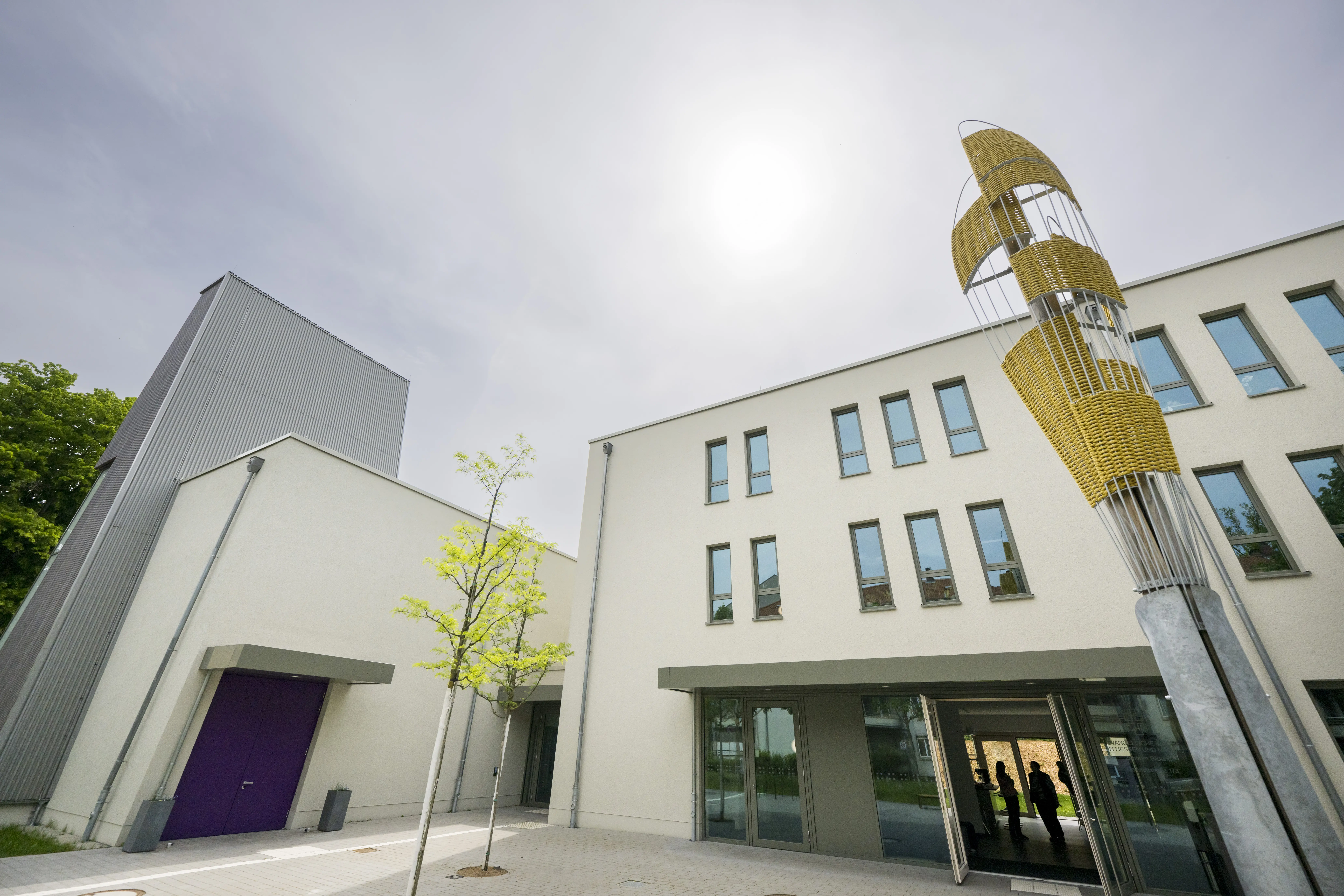 Hier schmiegen sich drei Flügelelemente an eine hölzerne Stele an. Die Flügelelemente bestehen aus einem Metallstangengerippe, das segmenthaft mit Tauwerk aufgeflochten ist. Diese Idee ist auf dem Vorplatz verortet und nimmt somit direkt die Besucher*innen in "Empfang".